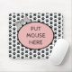 A mouse pad with a cat hiding and waiting for the mouse to be put down in the center where it says "PUT MOUSE HERE". In the background is a pattern of paws. Text, images and colors can all be changed. It is fully customizable.