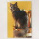 Black cat sitting on table with spools of yarn. Long hair, golden-green eyes. Light highlights the cat's fur and the spools of yarn.