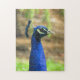 Peacock portrait. Beautiful blue neck and head. White mask around eye. Blue tufts on crown feathers.
