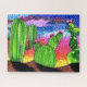 Brilliant colors of sunset on desert with cactus in the foreground. Artwork in dots by Deanna Pendrick.