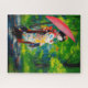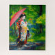 Japanese geisha Puzzle. Design name Just walking. The work depicts a serene summer scene in a park, with a dominant green color gradient creating a lush and calming atmosphere. In the foreground, a geisha in traditional clothing walks leisurely, wearing a colorful kimono and sporting traditional makeup. She is holding a pink umbrella to protect herself from the sun.