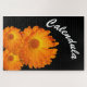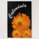 Orange Calendula buds with water drops on petals. Three overlapping blossoms in lower right. Above is curved white text (Calendula) with background in black.