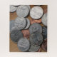 Coins spread on table top. Quarters, nickles, and pennies are scattered on top of each other.