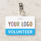 Easily personalize this plastic volunteer badge with your organization logo, volunteer title, or other custom text. It's PVC plastic and available with a metal clip, lanyard, or a retractable reel. This is a sky blue name badge you can customize to a different color and optionally add content to the back. No minimum order quantity and no setup fee.