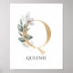 Letter Q monogram floral. Letter Q in golden brown texture accented with green watercolor compound leaves, flower blossoms and gold dust. Personalized with name in matching font.
