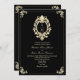 Elegant black and gold baroque wedding invitation with luxurious monogram crest, vintage scrolls, and ornate frame. This formal design includes a QR code on the back for easy RSVP through your wedding website. Perfect for glamorous, luxury, and formal weddings in black and gold themes. Ideal for couples who want a sophisticated and timeless invitation suite with matching RSVP, details, program, menu, and more.