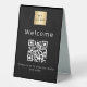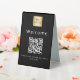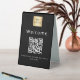 A classic black background, white colored text. With the text: Welcome, and Please scant to view our menu and order. Personalize and add your business logo, QR code and text.