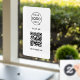 A simple custom white business vinyl window cling decal sign template in a modern minimalist style which can be easily updated with your company logo, QR code and custom text.