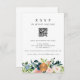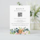 Modern rustic bohemian wedding or other event invitation RSVP card with scanning QR CODE to website and a trendy chic fully editable handwritten typography script featuring o border of pink, navy blue and ivory cream pastel bohemian flowers bouquets with sage green foliage and a round faux metallic gold copper monogrammed circle. +++++++++++++ Easy to personalize with your details! Suitable for rustic elegant outdoor garden backyard weddings, baby shower, birthday party, engagement, bridal shower or other celebrations and receptions.