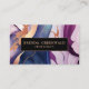 Modern, girly elegant networking card featuring digital image of liquid marble print in shades of blue, pink, purple gold and rose gold. Black stripe overlay. Great for beauty, fashion , entertainment and event professionals.