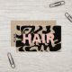 A bold font in blush pink, on an asymmetric abstract design in black. This version has a qr code on the back, and is aimed at hair stylists.