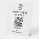 A simple custom white business Guest Check In & Out QR code pedestal sign in a modern minimalist style.