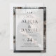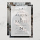 Elegant minimalist trendy monogrammed two photos budget affordable all in one online RSVP to website wedding invitation featuring a modern contemporary white and black bold typography names opaque overlay. ++++++++++ Easy to personalize with your details, QR code, monogram name initials, and photos on the front and back. ++++++++++ It is suitable for any season chic contemporary formal weddings. +++++++++++++ Colors of typography, frame, and background can be changed to match your wedding color palette.