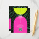 Neon yellow and pink arches over dark palm leaf background with monogram at top and white line art palm tree drawing on front and palm leaf on back.