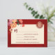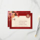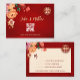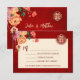 Red, orange and neutral tones peony flowers on a shimmering red background and a gold double happiness symbol. RSVP Chinese Wedding Card with a scannable qr code and bride and groom names.