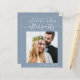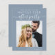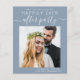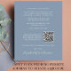 Modern budget-friendly dusty blue elopement / private wedding announcement and reception save the date that features your photo and "Save The Date For Our Happily Ever After Party" in a mix of simple white typography and a chic white script with swashes. Under your photo, add your names, reception date and location; on the back, personalize your wedding announcement, input your wedding website address to create a QR code for your guests to scan for more information and add your names in a signature-like script.