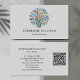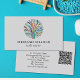 This reiki master's business card is decorated with a colorful mosaic tree of life design on a pale gray background.