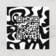 A QR code, on an asymmetric abstract design in black and white.