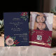 Celebrate your fall wedding with this elegant navy and burgundy wedding invitation featuring watercolor florals in blush, burgundy, and ivory with green foliage. The front highlights your wedding details with golden-inspired script, while the back includes a personal photo of the couple and a convenient QR code for RSVP and wedding website information. Perfect for modern couples who want both beauty and practicality in their stationery. Ideal for autumn weddings, this invitation blends romance with functionality. Matching RSVP cards, details cards, save the dates, menus, programs, and welcome signs are available in our collection for a complete wedding suite.
