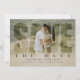 This design features a modern minimalist vellum overlay, a simple elegant photo picture couple, stylish trendy simple typography, a save the date typography text, with unique cool contemporary style, for an engaged engagement picture photo, a simplistic elegant modern minimal, with a two 2 photo layout template, a photo overlay clear transparent, a wedding save the date cards