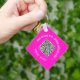The key chain is made of metal and really sturdy. The flower design is really cheerful. The logo and colors are clear and crisp!
