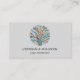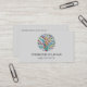 This yoga instructor business card is decorated with a colorful mosaic tree of life design on a pale gray background.