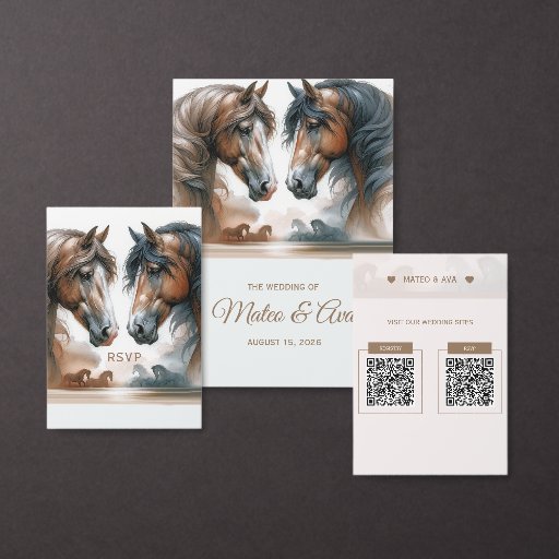 Do you share a love for horses? Consider this wedding QR code RSVP card. The unique front features beautiful horses. Your very own QR code is featured on the back. A great complement to the wedding invitations in the Beautiful Brown Horses Design collection. Nature oriented RSVP card with brown and earth tone colors. Customize with your desired text and create a custom QR code. Use the template to create your own horse wedding RSVP card.