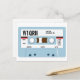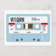 This is a cassette tape postcard design for an amateur radio QSL card. It has customizable text fields for call sign and location. On the cassette label, it has areas for you to fill in the QSO information such as time, date, mode etc.
