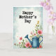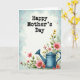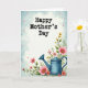 This card features a gentle digital illustration that pairs a clear Mother’s Day greeting with a cozy garden scene. Across the upper, lighter area, the words “Happy Mother’s Day” sit prominently in a dark, slightly textured font, centered and easy to read. Below the text, a muted teal watering can rests toward the lower right, like it’s just been set down after caring for the flowers ❤️. Around it, large soft pink blooms with small yellow centers spill through rich green leaves, sweeping diagonally from the bottom right toward the upper left in a tender, embracing flow. Smaller yellow flowers tuck between the greenery, adding a friendly, sunlit contrast 🌼. The background blends pale blue and white in a watercolor-like wash that suggests open sky and soft clouds. Tiny red and yellow specks are scattered across the scene like drifting petals or light confetti.