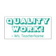 This inspirational rubber stamp design features the message "QUALITY WORK!" and a personalized tutor's name. It could be used by a teacher, educator, instructor, or tutor when marking assignments, to indicate that the student has done a great job.