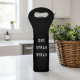 Punny wine bag in modern black and white features the quote "que syrah syrah."