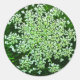 This lovely, lacy white flower is the wild carrot. It was introduced and naturalised in North America, where it is often known as "Queen Anne's lace". It is so called because the flower resembles lace; the red flower in the center represents a blood droplet where Queen Anne pricked herself with a needle when she was making the lace. The single flower head on this sticker, with it's hundreds of tiny blossoms, is set against a background of green, yellow and black.