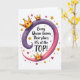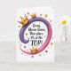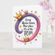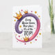 Designed with a confident declaration at the center, the card features the text “Every Queen knows Their place: It’s at the TOP!” in flowing lettering that follows a sweeping ribbon shape. The words sit across a curved banner on a white background, with the lettering in dark tones for contrast and the phrase “TOP!” standing out near the right side. The ribbon shifts from deep purple on the left to soft pink on the right, creating a gentle sense of motion like two friends leaning in close ❤️. Three cartoon-style crowns in shiny golden yellow rest along the curve, each decorated with small red heart details that add a sweet, affectionate touch 🌼. Around the main design, tiny gold star sparkles and scattered little red hearts float in the open white space like confetti. Soft shading on the crowns gives them a slightly raised look, while the ribbon’s edges stay smooth and rounded. Small golden stars and crimson hearts are sprinkled evenly around the banner, with the densest cluster near the outer corners.