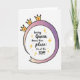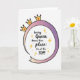 This greeting card features a confident message centered on a white background, framed to feel like a gentle ribbon curling around it. In the middle, the main text reads “Every Queen knows their place: it’s at the TOP!” in thick, flowing black lettering that leans slightly upward as if cheering someone on. The frame shifts from a soft blush pink on the left to a deep purple on the right, creating a sweet-to-strong color transition that feels supportive ❤️. Three small gold crowns rest along the top edge of the border, each marked with a tiny red heart, like affectionate nods from close friends. Around the words, scattered gold starbursts sparkle like little celebrations, adding a light, friendly energy 🌼. The layout keeps the phrase as the clear focal point, with the decorations staying mostly around the edges so the message stands out. A ribbon-like tail extends from the lower right of the border, curling outward in purple with a thin gold outline.