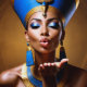 Queen Nefertiti (c. 1370 - c. 1330 BCE). Queen Nefertiti, the Great Royal Wife of Pharaoh Akhenaten, is one of the most famous figures of ancient Egypt. Known for her beauty and powerful position, she co-ruled during one of the wealthiest periods in Egyptian history and played a role in the country's religious revolution by promoting the worship of Aten, the sun disk. An imagined stylized portrait of Queen Nefertiti with an elongated neck and high cheekbones and full lips, displaying regal elegance and beauty.