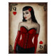 Pinup style queen of hearts design with grunge effects. Features an illustration of a beautiful young woman, with long black hair, wearing a red corset.