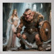 A regal queen stands beside a fierce warrior in a ruined castle setting. The setting is dramatic, with light streaming through ancient windows.