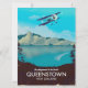 Queenstown New Zealand vintage style travel poster print of a prop plane flying over a deep lake in the nation.