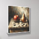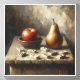 Bring a sense of hushed wonder to your walls with this evocative still life, featuring a ripe pear, a crisp red apple, and a scattering of dominoes across a weathered wooden table. Textured brushstrokes and a warm muted palette create an atmosphere of quiet contemplation, as if time itself has paused mid-game.