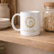 Quiet Gold Swirl features the phrase Molten Quiet in a refined serif, paired with a gold-lined swirl on a clean white ceramic base. The minimal layout suits coffee breaks, desk setups, or open shelving, blending easily with neutral kitchens and modern daily routines.
