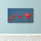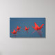 A family of red origami cranes floats across the still water of a pool while the raindrops splash around them.