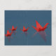 A family of red origami cranes floats across the still water of a pool while the raindrops splash around them.