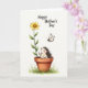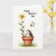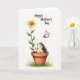 This greeting card features a small, textured critter with rosy cheeks tucked inside a rustic terracotta pot, lifting one tiny paw as if waving to someone it cares about ❤️. Beside it, a tall sunflower-like bloom rises with rich green leaves, leaning slightly as though sharing the space in a gentle, friendly way. Above the flower, a delicate insect with translucent wings hovers, drawn toward the scene like a quiet admirer. The background is bright white with a soft, watercolor-like wash that keeps everything light and airy, like a calm spring morning. A few wisps of emerald grass sit at the base of the pot to ground the composition, adding a natural touch 🌼. Near the top of the card, the words “Happy Mother’s Day” appear in a simple, easy-to-read style, set in a darker tone that stands out clearly against the white. The flower’s warm yellow petals and the pot’s earthy orange-brown tones create a cozy contrast with the critter’s gentle, pale coloring. The insect is painted just above the bloom, with faint gray-blue wings and a tiny body outlined softly against the white space.