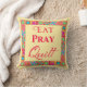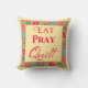 Add some love of quilting with this unique decorative throw pillow for those who love quilting. The words “Eat Pray Quilt” says it all for a quilte that you can show off with this decorative throw pillow. These words in red text and 3 differnt fonts and are centered in a colorful quilt block art border on a yellow background. The colors are red, pink, yellow, orange, turquoise blue, and green. This original art is by fabric designer Phyllis Dobbs and coordinates with other products in this store. The border includes favorite blocks such as the log cabin, star, square in a square, and others as well as an applique flower block.