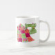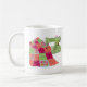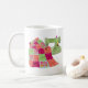 Vintage style sewing machine with a quilt in shades of green, orange, pink and blue. If you're one of the many quilting and sewing enthusiasts out there then you'll love this cute mug for your morning coffee or tea.