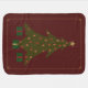This elegant design features a quilted Christmas tree with jewel-toned ornaments adorning it and presents underneath, all surrounded by a delicate gold filigree border with jewels at the corners.