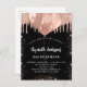 A black background. Decorated with rose gold, blush faux glitter drips, paint dripping look and balloons. Personalize and add a name, age and party details. The name is written with a hand lettered style script