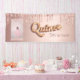 A banner for a girly and glamorous Quinceañera, 15th birthday party. A faux rose gold metallic looking background with rose gold, pink faux glitter drips, paint dripping look. Personalize and add your own photo of the birthday girl and her name. The word: Quince is written with a golden balloon style font, script.