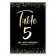 No Quinceañera party is complete without personalized table number cards. Let your daughter be proud, rejoice and celebrate her milestone at her perfectly coordinated party. Stunning, modern, sparkly gold faux foil handwritten script and tiny confetti glitter dots overlay a sophisticated, dramatic black background. Personalize the custom text with the table number, her name, and date of event. Change the number for each table that you need and add one at a time to your cart. Guaranteed to add stylish memories of her occasion. Matching and coordinating invites, envelopes, address labels, stickers, napkins and other Quinceañera goodies are also available in this trendy and special collection.