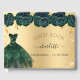 For a Quinceañera, 15th birthday party. A golden background with faux gold glitter, a green dress and green roses, florals. The name is written with a modern hand lettered style script. Personalize and add a name and date.